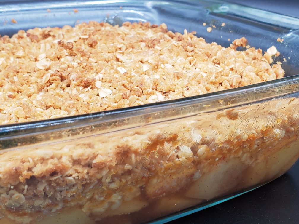 - Mix all ingredients together, then spread evenly over top of apples. Bake for 50-55 minutes, until the topping is browned and the apples are easily pierced. Let cool for a few minutes before serving. Top with ice cream if desired and enjoy!