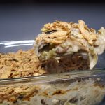 Remove pan from heat and add green beans, mushroom soup, and Tabasco and mix well. Pour into baking dish and smooth it out to an even layer. Sprinkle parmesan cheese over the top, then add crispy jalapeno/onions evenly over the top.