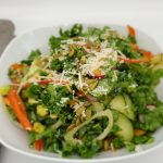 Using a mandoline, slice bell peppers, red onion, radish, and cucumber and add to bowl (you can sliced thinly if you don't have a mandoline). Add parmesan cheese, roasted pumpkin seeds, white balsamic vinaigrette, salt and pepper to taste. Put lid on bowl and shake well to combine. Serve and enjoy!