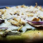 Evenly spread pesto on pita. Sprinkle cheese evenly over pesto and top with onions, mushrooms, and chicken.